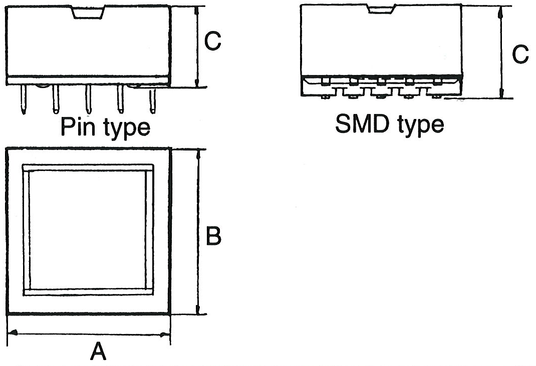 | Type | A | B | C | Type | Pin hole config. | SMD Pad config. |